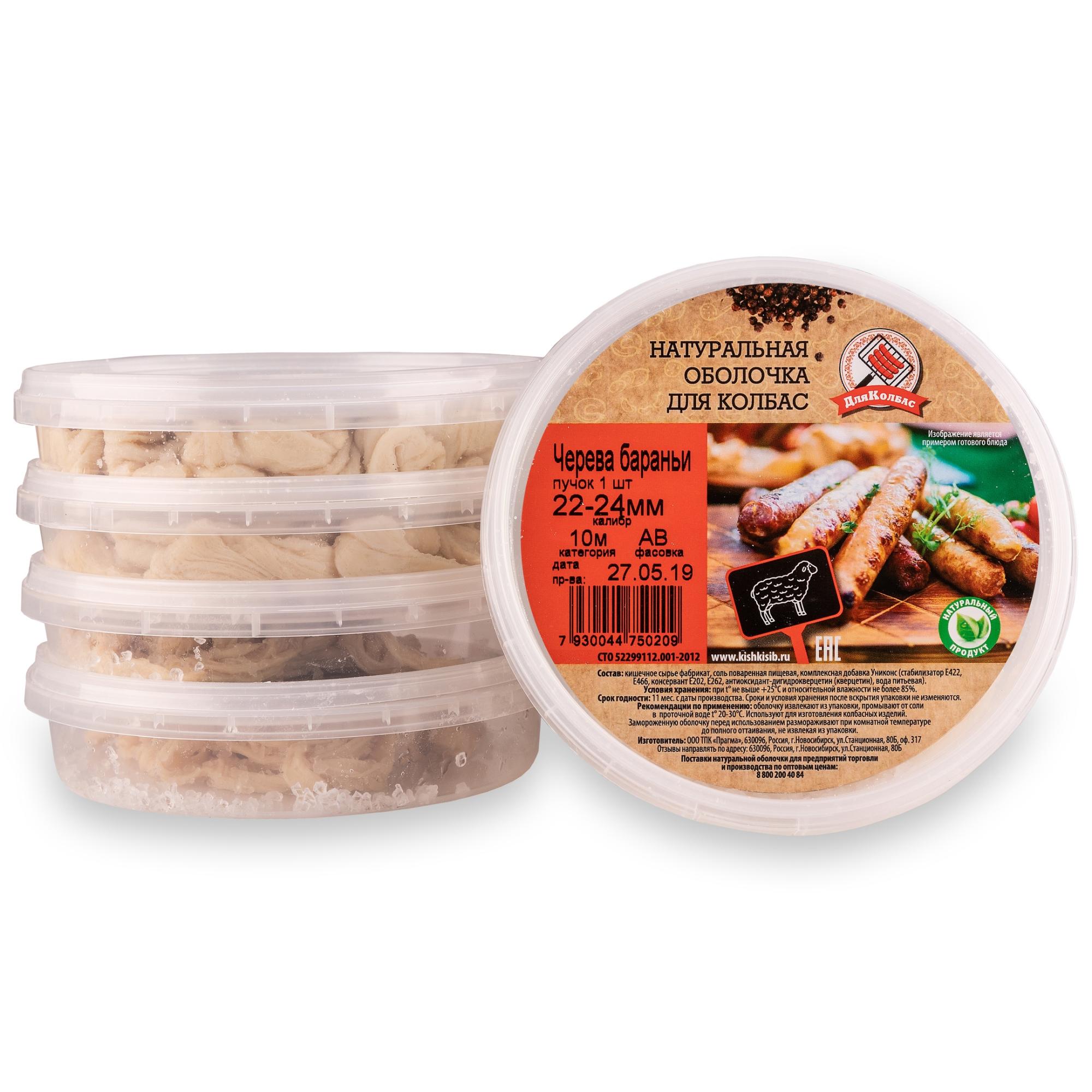 Натуральная оболочка баранья — подходит для приготовления тонких вяленых и копченых колбасок на закуску или же колбасок для жарки. Бараньи черева гораздо нежнее свиной и говяжьей оболочки, требует более деликатного подхода к изготовлению. Тонкая по диаметру оболочка, требует узкую насадку для мясорубки или шприца для набивки. После термической обработки продукта – оболочку употребляют с получившимся колбасным изделием.